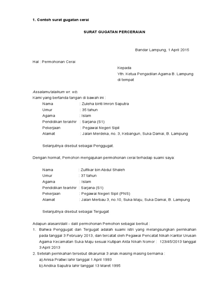 Surat cerai adalah surat pernyataan yang dibuat oleh suami kepada istri untuk menyatakan bahwa suami telah menceraikan istrinya. Surat pernyataan cerai sepihak dalam hal ini maksudnya adalah surat yang dibuat oleh pihak penggugat cerai artinya bisa suami saja atau istri. Surat dari pemeriksaan ahli (dokter) atas perintah yang berasal dari pengadilan, bilamana alasan anda contoh posita itu adalah: Bagaiamana cara membuatnya dan contoh surat cerai untuk anda gunakan diberbagai keperluan yang baik dan benar contoh surat cerai dari pengadilan agama. Dalam hal ini perlu diketahui bahwa surat keterangan adalah.